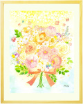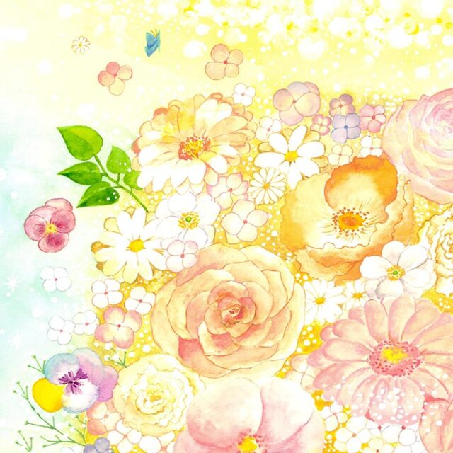 | 水彩ならではの透明感とやわらかな色彩で描かれた、光と花束をテーマに描かれた作品「光 〜hikari〜」。画面上部に広がる優しいイエローは、あたたかな「光」の象徴。まるで空から光がそっと降り注ぎ、花々を包み込むように描かれ、未来へ向かう希望や、静かに背中を押してくれるような温もりが感じられます。 束ねられた花たちは、一つひとつが大切な出来事や人との出会いを表すモチーフ。支えてくれた時間、笑い合えた瞬間、そっと寄り添ってくれた気持ちを、一輪ずつ丁寧に束ねた花束として表現しています。 作品の中には、蝶が舞い、小さな青い鳥たちが寄り添い、まるで関わる大切な人たちのように、あたたかく見守り、幸せをそっと運んでくれる象徴として描かれています。 「出会いの尊さ」や「大切な時間の積み重ね」を静かに語りかけるような作品です。日常に優しい光をもたらし、贈り物としても喜ばれる一枚です。 |